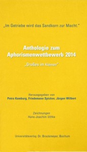 Kamburg, Petra, Friedemann Spicker, Jürgen Wilbert (Hrsg.): „Im Getriebe wird das Sandkorn zur Macht.“ Anthologie zum Aphorismenwettbewerb 2014 „Großes im Kleinen.“ Bochum: Brockmeyer 2016 |