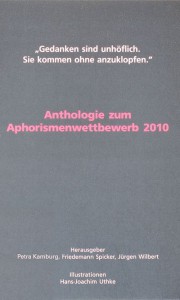 Kamburg, Petra, Friedemann Spicker, Jürgen Wilbert (Hrsg.): „Gedanken sind unhöflich. Sie kommen ohne anzuklopfen.“ Anthologie zum Aphorismenwettbewerb 2010 Bochum: Brockmeyer 2016 |